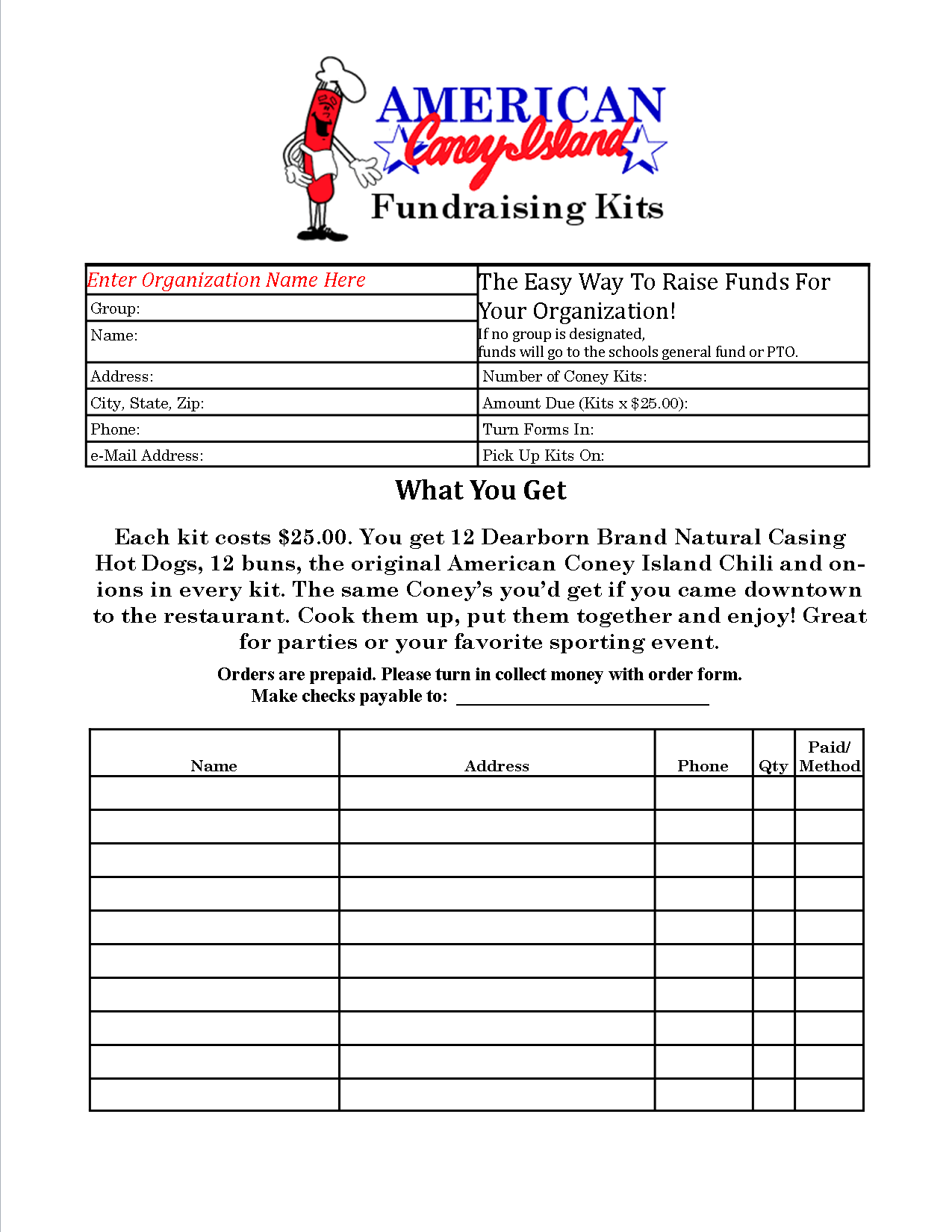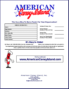 on the Organizations Order Form and fax it to (313) 964-5598, call Coney Hot Line at (586) 219-0995 or email your order at eat@AmericanConeyIsland.com. We will
